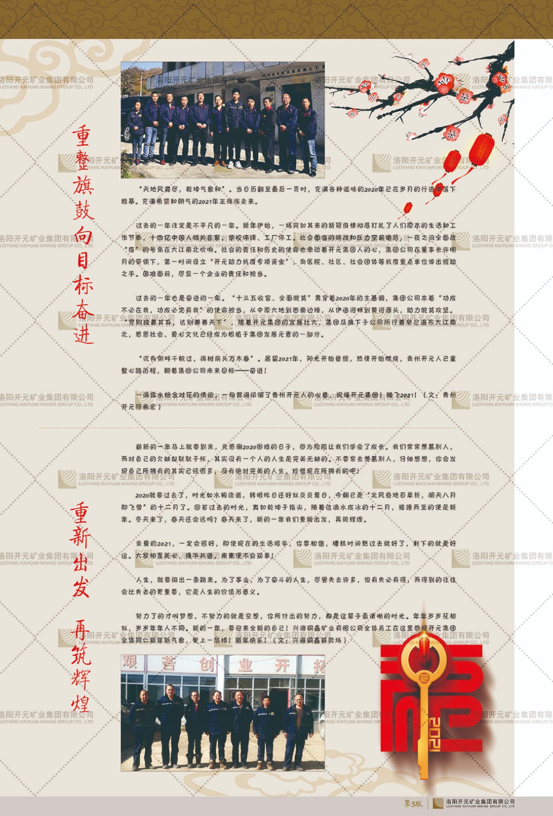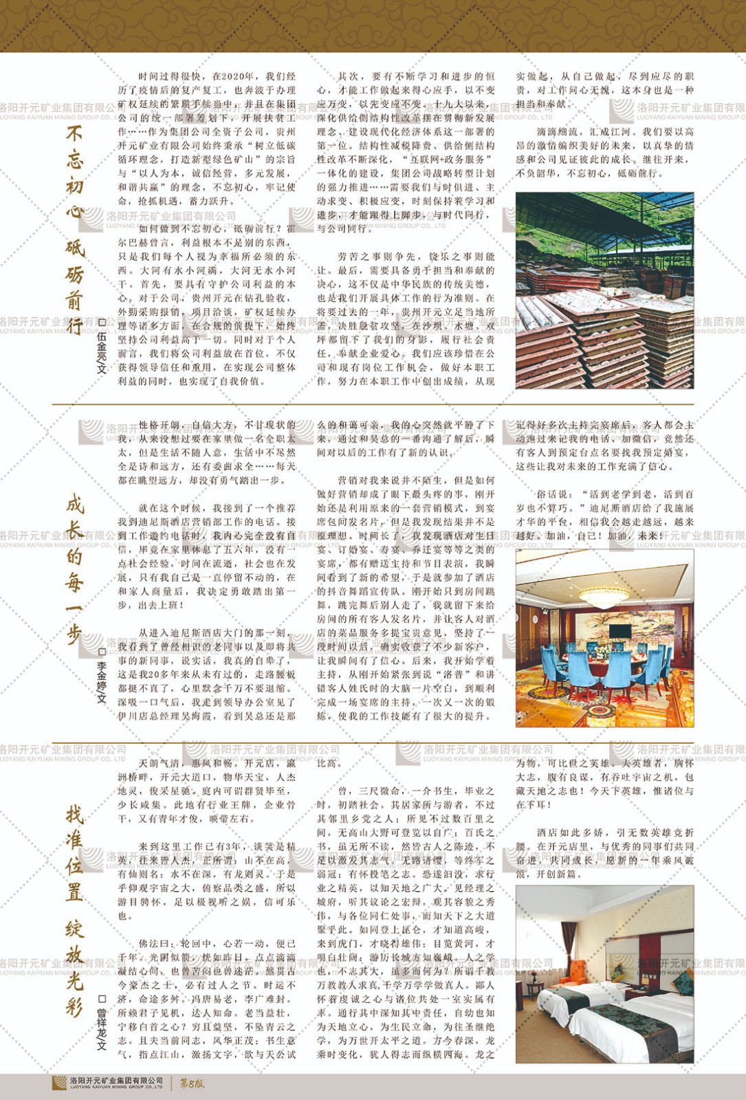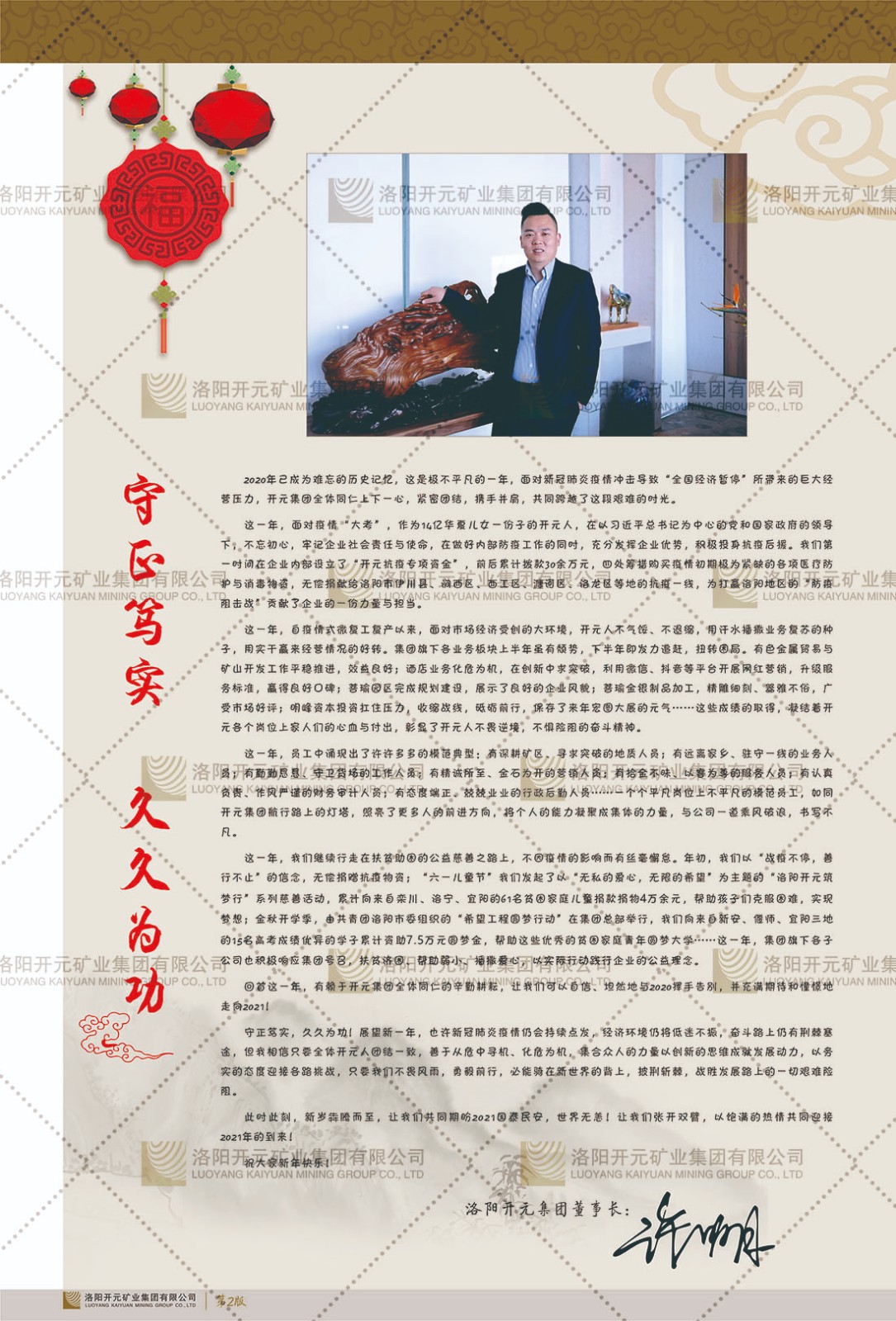 洛陽(yáng)開(kāi)元礦業(yè)集團(tuán)有限公司簡(jiǎn)介洛陽(yáng)開(kāi)元礦業(yè)集團(tuán)有限公司,始成立于2006年,位于洛陽(yáng)市開(kāi)元大道269號(hào)。集團(tuán)旗下共有十余家全資子公司,業(yè)務(wù)涉及有色金屬礦山開(kāi)發(fā)、礦產(chǎn)品購(gòu)銷(xiāo)與進(jìn)出口貿(mào)易、房地產(chǎn)開(kāi)發(fā)、文化藝術(shù)、企業(yè)管理與咨詢、資本投資等多個(gè)領(lǐng)域。2024年,集團(tuán)公司銷(xiāo)售總額達(dá)7.8億元。民建河南省委委員、民建河南省委企業(yè)委副主任、民建洛陽(yáng)市委委員、企業(yè)委主任、洛陽(yáng)民建企業(yè)家協(xié)會(huì)會(huì)長(zhǎng)許明月是公司創(chuàng)始人,現(xiàn)任洛陽(yáng)開(kāi)元礦業(yè)集團(tuán)有限公司董事長(zhǎng)。在礦業(yè)領(lǐng)域,洛陽(yáng)開(kāi)元礦業(yè)集團(tuán)擁有多家實(shí)力雄厚的子公司:貴州開(kāi)元礦業(yè)有限公司探、采礦權(quán)面積共11.33平方公里;興海縣銅鑫礦業(yè)有限公司探礦權(quán)面積8.76平方公里,礦山資源潛力巨大;2021年,開(kāi)元集團(tuán)與盧氏中科礦業(yè)有限公司開(kāi)展戰(zhàn)略合作。盧氏中科礦業(yè)有限公司專(zhuān)注于有色金屬的浮選、加工和銷(xiāo)售,擁有強(qiáng)大的技術(shù)支撐平臺(tái),是集探、采、選、冶、研為一體的中大型綜合礦業(yè)企業(yè)。目前,盧氏中科王家河1000噸選礦廠已成功投產(chǎn),雙河金礦、柳關(guān)欒盧鉛鋅礦相繼順利開(kāi)工,樓房銀礦與圪老灣鉛鋅礦的深部探礦重大突破,標(biāo)志著礦山版圖取得重大進(jìn)展,為開(kāi)元集團(tuán)后續(xù)發(fā)展奠定了堅(jiān)實(shí)基礎(chǔ)。在文化傳媒領(lǐng)域,洛陽(yáng)市明月美術(shù)館通過(guò)豐富多樣的藝術(shù)展覽、學(xué)術(shù)研討和公共教育活動(dòng),努力打造一個(gè)集展覽、交流、教育、研究為一體的綜合性藝術(shù)平臺(tái)。此外,在金融投資領(lǐng)域,開(kāi)元集團(tuán)旗下的北京明峰資本管理有限公司專(zhuān)注于投資具有高增長(zhǎng)潛力的優(yōu)秀企業(yè),特別是高科技、新能源、環(huán)保等新興產(chǎn)業(yè),為客戶提供個(gè)性化的資產(chǎn)配置服務(wù)。在做好企業(yè)經(jīng)營(yíng)的同時(shí),開(kāi)元集團(tuán)始終不忘企業(yè)的社會(huì)責(zé)任和家國(guó)情懷,以突出的愛(ài)心公益事跡,開(kāi)展了一系列公益慈善活動(dòng):“民建林”公益事業(yè)通過(guò)“思源基金”“幫幫公益”線上公益平臺(tái),與眾多愛(ài)心人士籌措資金20余萬(wàn)元;資助541名貧困大學(xué)生共計(jì)270余萬(wàn)元,推進(jìn)“數(shù)字助力——河南AI人才培養(yǎng)”;捐款10萬(wàn)元,馳援京津冀、黑龍江洪水地質(zhì)災(zāi)害……公司于2017年底被洛陽(yáng)市慈善總會(huì)評(píng)為“洛陽(yáng)慈善風(fēng)云榜——十大愛(ài)心集體”。洛陽(yáng)開(kāi)元礦業(yè)集團(tuán)有限公司秉承持續(xù)發(fā)展理念,憑借多年來(lái)良好的企業(yè)信譽(yù)與經(jīng)營(yíng)業(yè)績(jī),與全國(guó)多家企業(yè)建立了良好合作關(guān)系,受到社會(huì)各界的一致好評(píng),多次榮獲“納稅標(biāo)兵”“先進(jìn)企業(yè)”“招商引資模范企業(yè)”等榮譽(yù)稱(chēng)號(hào)?;赝麃?lái)時(shí)路,開(kāi)元人勠力同心,以“闖”的精神和“創(chuàng)”的勁頭,一路披荊斬棘,踏過(guò)千山萬(wàn)水;展望新未來(lái),開(kāi)元人凝心聚力,不執(zhí)于“舊”,無(wú)畏于“新”,秉承“勇于跨越,追求卓越”的企業(yè)精神,乘著國(guó)家高質(zhì)量發(fā)展新征程的東風(fēng),跨過(guò)高山,越過(guò)大海,向著集團(tuán)多元化、國(guó)際化的目標(biāo),逐夢(mèng)遠(yuǎn)航,跨越前行!