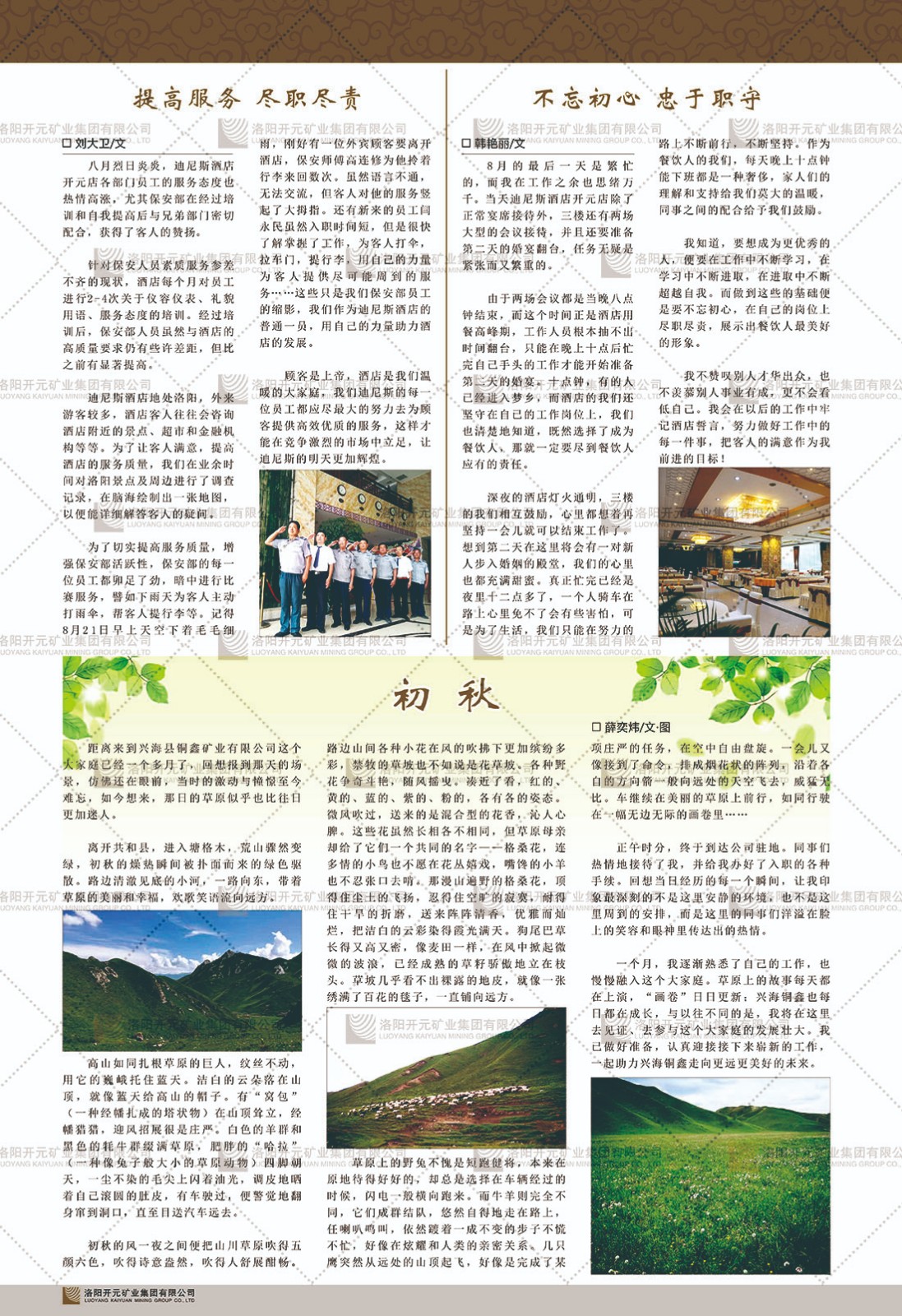 洛陽(yáng)開(kāi)元礦業(yè)集團(tuán)有限公司簡(jiǎn)介洛陽(yáng)開(kāi)元礦業(yè)集團(tuán)有限公司,始成立于2006年,位于洛陽(yáng)市開(kāi)元大道269號(hào)。集團(tuán)旗下共有十余家全資子公司,業(yè)務(wù)涉及有色金屬礦山開(kāi)發(fā)、礦產(chǎn)品購(gòu)銷(xiāo)與進(jìn)出口貿(mào)易、房地產(chǎn)開(kāi)發(fā)、文化藝術(shù)、企業(yè)管理與咨詢(xún)、資本投資等多個(gè)領(lǐng)域。2024年,集團(tuán)公司銷(xiāo)售總額達(dá)7.8億元。民建河南省委委員、民建河南省委企業(yè)委副主任、民建洛陽(yáng)市委委員、企業(yè)委主任、洛陽(yáng)民建企業(yè)家協(xié)會(huì)會(huì)長(zhǎng)許明月是公司創(chuàng)始人,現(xiàn)任洛陽(yáng)開(kāi)元礦業(yè)集團(tuán)有限公司董事長(zhǎng)。在礦業(yè)領(lǐng)域,洛陽(yáng)開(kāi)元礦業(yè)集團(tuán)擁有多家實(shí)力雄厚的子公司:貴州開(kāi)元礦業(yè)有限公司探、采礦權(quán)面積共11.33平方公里;興??h銅鑫礦業(yè)有限公司探礦權(quán)面積8.76平方公里,礦山資源潛力巨大;2021年,開(kāi)元集團(tuán)與盧氏中科礦業(yè)有限公司開(kāi)展戰(zhàn)略合作。盧氏中科礦業(yè)有限公司專(zhuān)注于有色金屬的浮選、加工和銷(xiāo)售,擁有強(qiáng)大的技術(shù)支撐平臺(tái),是集探、采、選、冶、研為一體的中大型綜合礦業(yè)企業(yè)。目前,盧氏中科王家河1000噸選礦廠(chǎng)已成功投產(chǎn),雙河金礦、柳關(guān)欒盧鉛鋅礦相繼順利開(kāi)工,樓房銀礦與圪老灣鉛鋅礦的深部探礦重大突破,標(biāo)志著礦山版圖取得重大進(jìn)展,為開(kāi)元集團(tuán)后續(xù)發(fā)展奠定了堅(jiān)實(shí)基礎(chǔ)。在文化傳媒領(lǐng)域,洛陽(yáng)市明月美術(shù)館通過(guò)豐富多樣的藝術(shù)展覽、學(xué)術(shù)研討和公共教育活動(dòng),努力打造一個(gè)集展覽、交流、教育、研究為一體的綜合性藝術(shù)平臺(tái)。此外,在金融投資領(lǐng)域,開(kāi)元集團(tuán)旗下的北京明峰資本管理有限公司專(zhuān)注于投資具有高增長(zhǎng)潛力的優(yōu)秀企業(yè),特別是高科技、新能源、環(huán)保等新興產(chǎn)業(yè),為客戶(hù)提供個(gè)性化的資產(chǎn)配置服務(wù)。在做好企業(yè)經(jīng)營(yíng)的同時(shí),開(kāi)元集團(tuán)始終不忘企業(yè)的社會(huì)責(zé)任和家國(guó)情懷,以突出的愛(ài)心公益事跡,開(kāi)展了一系列公益慈善活動(dòng):“民建林”公益事業(yè)通過(guò)“思源基金”“幫幫公益”線(xiàn)上公益平臺(tái),與眾多愛(ài)心人士籌措資金20余萬(wàn)元;資助541名貧困大學(xué)生共計(jì)270余萬(wàn)元,推進(jìn)“數(shù)字助力——河南AI人才培養(yǎng)”;捐款10萬(wàn)元,馳援京津冀、黑龍江洪水地質(zhì)災(zāi)害……公司于2017年底被洛陽(yáng)市慈善總會(huì)評(píng)為“洛陽(yáng)慈善風(fēng)云榜——十大愛(ài)心集體”。洛陽(yáng)開(kāi)元礦業(yè)集團(tuán)有限公司秉承持續(xù)發(fā)展理念,憑借多年來(lái)良好的企業(yè)信譽(yù)與經(jīng)營(yíng)業(yè)績(jī),與全國(guó)多家企業(yè)建立了良好合作關(guān)系,受到社會(huì)各界的一致好評(píng),多次榮獲“納稅標(biāo)兵”“先進(jìn)企業(yè)”“招商引資模范企業(yè)”等榮譽(yù)稱(chēng)號(hào)?;赝麃?lái)時(shí)路,開(kāi)元人勠力同心,以“闖”的精神和“創(chuàng)”的勁頭,一路披荊斬棘,踏過(guò)千山萬(wàn)水;展望新未來(lái),開(kāi)元人凝心聚力,不執(zhí)于“舊”,無(wú)畏于“新”,秉承“勇于跨越,追求卓越”的企業(yè)精神,乘著國(guó)家高質(zhì)量發(fā)展新征程的東風(fēng),跨過(guò)高山,越過(guò)大海,向著集團(tuán)多元化、國(guó)際化的目標(biāo),逐夢(mèng)遠(yuǎn)航,跨越前行!