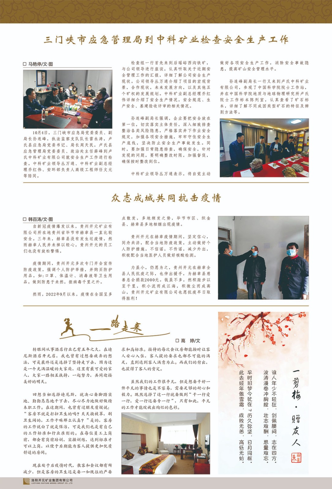 洛陽(yáng)開元礦業(yè)集團(tuán)有限公司簡(jiǎn)介洛陽(yáng)開元礦業(yè)集團(tuán)有限公司,始成立于2006年,位于洛陽(yáng)市開元大道269號(hào)。集團(tuán)旗下共有十余家全資子公司,業(yè)務(wù)涉及有色金屬礦山開發(fā)、礦產(chǎn)品購(gòu)銷與進(jìn)出口貿(mào)易、房地產(chǎn)開發(fā)、文化藝術(shù)、企業(yè)管理與咨詢、資本投資等多個(gè)領(lǐng)域。2024年,集團(tuán)公司銷售總額達(dá)7.8億元。民建河南省委委員、民建河南省委企業(yè)委副主任、民建洛陽(yáng)市委委員、企業(yè)委主任、洛陽(yáng)民建企業(yè)家協(xié)會(huì)會(huì)長(zhǎng)許明月是公司創(chuàng)始人,現(xiàn)任洛陽(yáng)開元礦業(yè)集團(tuán)有限公司董事長(zhǎng)。在礦業(yè)領(lǐng)域,洛陽(yáng)開元礦業(yè)集團(tuán)擁有多家實(shí)力雄厚的子公司:貴州開元礦業(yè)有限公司探、采礦權(quán)面積共11.33平方公里;興??h銅鑫礦業(yè)有限公司探礦權(quán)面積8.76平方公里,礦山資源潛力巨大;2021年,開元集團(tuán)與盧氏中科礦業(yè)有限公司開展戰(zhàn)略合作。盧氏中科礦業(yè)有限公司專注于有色金屬的浮選、加工和銷售,擁有強(qiáng)大的技術(shù)支撐平臺(tái),是集探、采、選、冶、研為一體的中大型綜合礦業(yè)企業(yè)。目前,盧氏中科王家河1000噸選礦廠已成功投產(chǎn),雙河金礦、柳關(guān)欒盧鉛鋅礦相繼順利開工,樓房銀礦與圪老灣鉛鋅礦的深部探礦重大突破,標(biāo)志著礦山版圖取得重大進(jìn)展,為開元集團(tuán)后續(xù)發(fā)展奠定了堅(jiān)實(shí)基礎(chǔ)。在文化傳媒領(lǐng)域,洛陽(yáng)市明月美術(shù)館通過(guò)豐富多樣的藝術(shù)展覽、學(xué)術(shù)研討和公共教育活動(dòng),努力打造一個(gè)集展覽、交流、教育、研究為一體的綜合性藝術(shù)平臺(tái)。此外,在金融投資領(lǐng)域,開元集團(tuán)旗下的北京明峰資本管理有限公司專注于投資具有高增長(zhǎng)潛力的優(yōu)秀企業(yè),特別是高科技、新能源、環(huán)保等新興產(chǎn)業(yè),為客戶提供個(gè)性化的資產(chǎn)配置服務(wù)。在做好企業(yè)經(jīng)營(yíng)的同時(shí),開元集團(tuán)始終不忘企業(yè)的社會(huì)責(zé)任和家國(guó)情懷,以突出的愛心公益事跡,開展了一系列公益慈善活動(dòng):“民建林”公益事業(yè)通過(guò)“思源基金”“幫幫公益”線上公益平臺(tái),與眾多愛心人士籌措資金20余萬(wàn)元;資助541名貧困大學(xué)生共計(jì)270余萬(wàn)元,推進(jìn)“數(shù)字助力——河南AI人才培養(yǎng)”;捐款10萬(wàn)元,馳援京津冀、黑龍江洪水地質(zhì)災(zāi)害……公司于2017年底被洛陽(yáng)市慈善總會(huì)評(píng)為“洛陽(yáng)慈善風(fēng)云榜——十大愛心集體”。洛陽(yáng)開元礦業(yè)集團(tuán)有限公司秉承持續(xù)發(fā)展理念,憑借多年來(lái)良好的企業(yè)信譽(yù)與經(jīng)營(yíng)業(yè)績(jī),與全國(guó)多家企業(yè)建立了良好合作關(guān)系,受到社會(huì)各界的一致好評(píng),多次榮獲“納稅標(biāo)兵”“先進(jìn)企業(yè)”“招商引資模范企業(yè)”等榮譽(yù)稱號(hào)?;赝麃?lái)時(shí)路,開元人勠力同心,以“闖”的精神和“創(chuàng)”的勁頭,一路披荊斬棘,踏過(guò)千山萬(wàn)水;展望新未來(lái),開元人凝心聚力,不執(zhí)于“舊”,無(wú)畏于“新”,秉承“勇于跨越,追求卓越”的企業(yè)精神,乘著國(guó)家高質(zhì)量發(fā)展新征程的東風(fēng),跨過(guò)高山,越過(guò)大海,向著集團(tuán)多元化、國(guó)際化的目標(biāo),逐夢(mèng)遠(yuǎn)航,跨越前行!